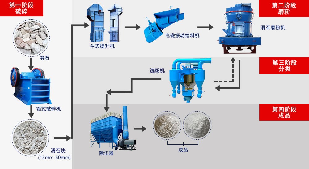 滑石磨粉生產線設備新型密封結構設計,配置脈沖除塵設備,過環評標準,持續為客戶創造收益;